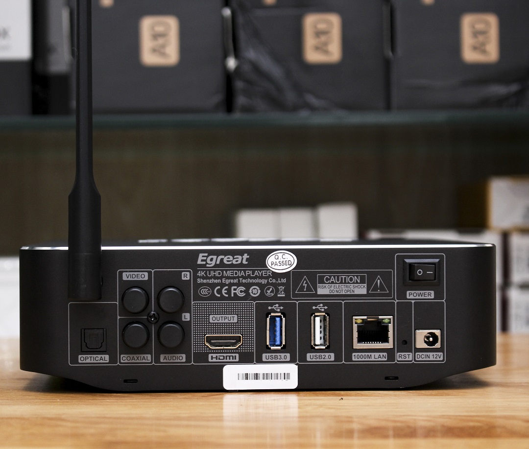 Độ hoàn thiện của máy được thể hiện rất rõ ở phía sau, với đầy đủ các cổng kết nối âm thanh hình ảnh từ cao cấp nhất tới thông dụng nhất. Bao gồm 1 cổng HDMI 2.0, 1 cổng Optical, 1 cổng Coaxial, 3 cổng RCA, 1 cổng LAN, 2 cổng USB và 1 công tắc nguồn. Tất cả các thông tin đều được in rất sắc nét và chuyên nghiệp, hoàn toàn không có chi tiết thừa. Thậm chí 4 kết nối Analog đều được bọc cao su tránh va đập và oxi hóa nếu không sử dụng, Egreat thực sự rất biết cách làm hài lòng khách hàng.